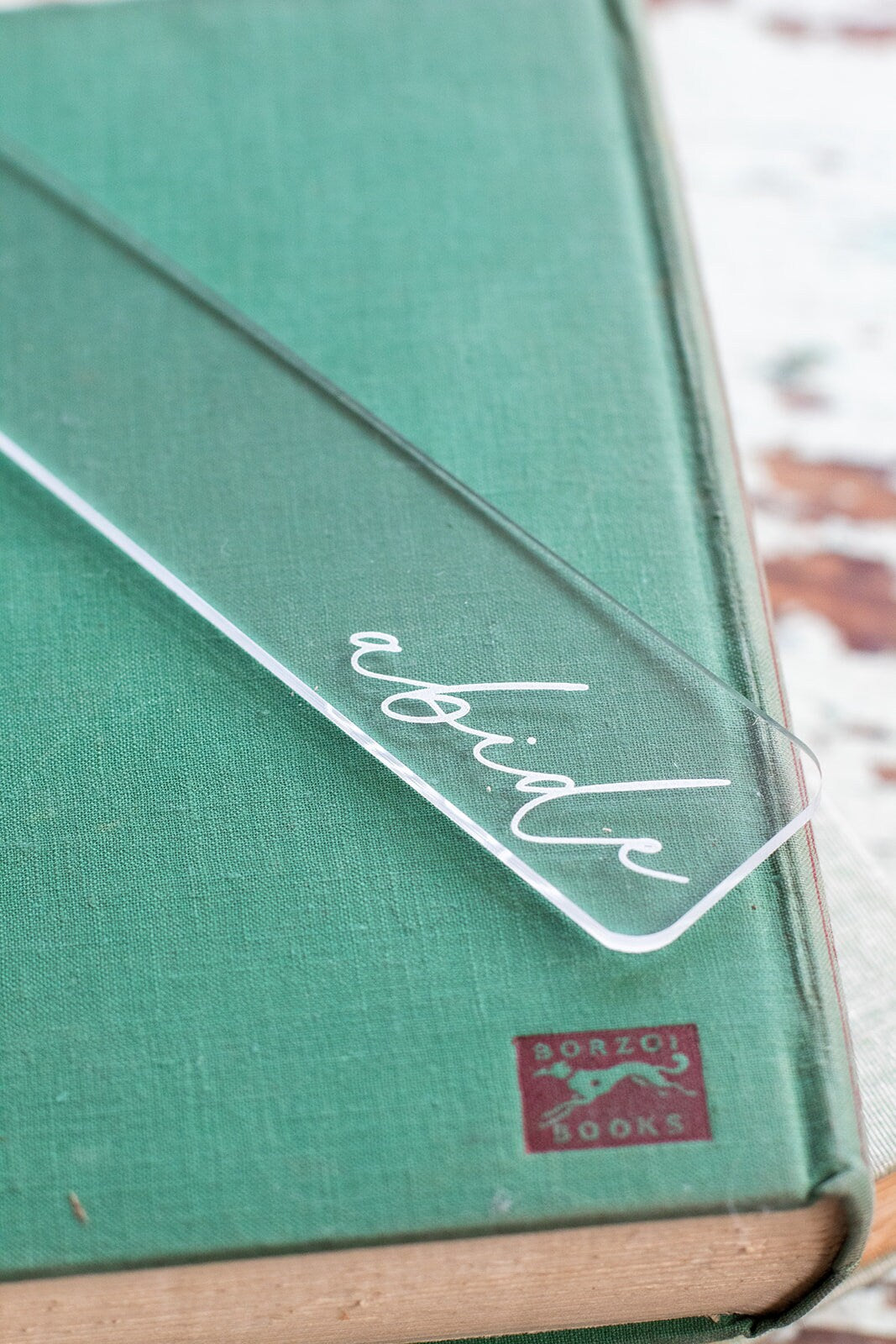 Clear Acrylic, Laser Engraved Bookmark Customize with a word or phrase of your choice.